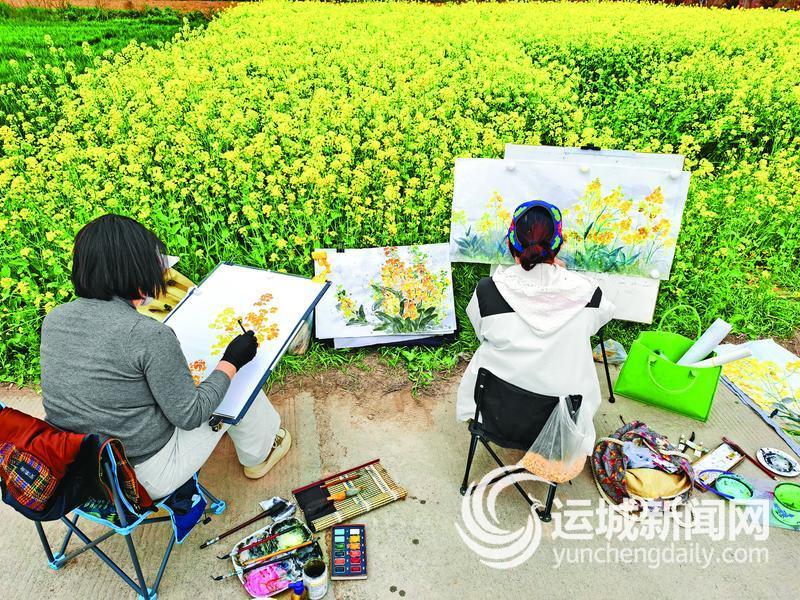 4月4日,美术爱好者在平陆县部官镇黄灿灿的油菜花田边写生,笔墨间尽显自然之美,为赏花季增添文艺气息。