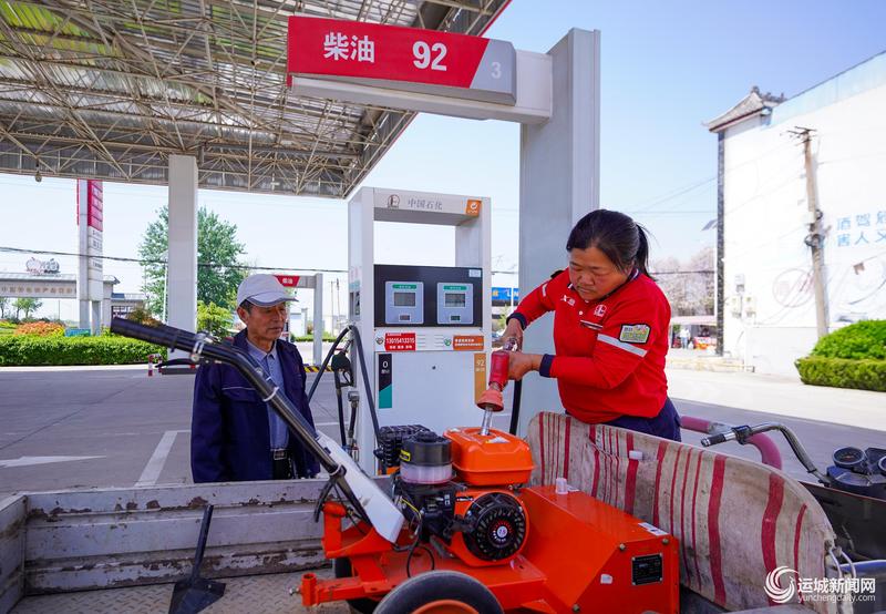 临猗县北景乡一中国石化加油站工作人员正在给附近村民的农机加油。 本报记者 陈方斌 摄
