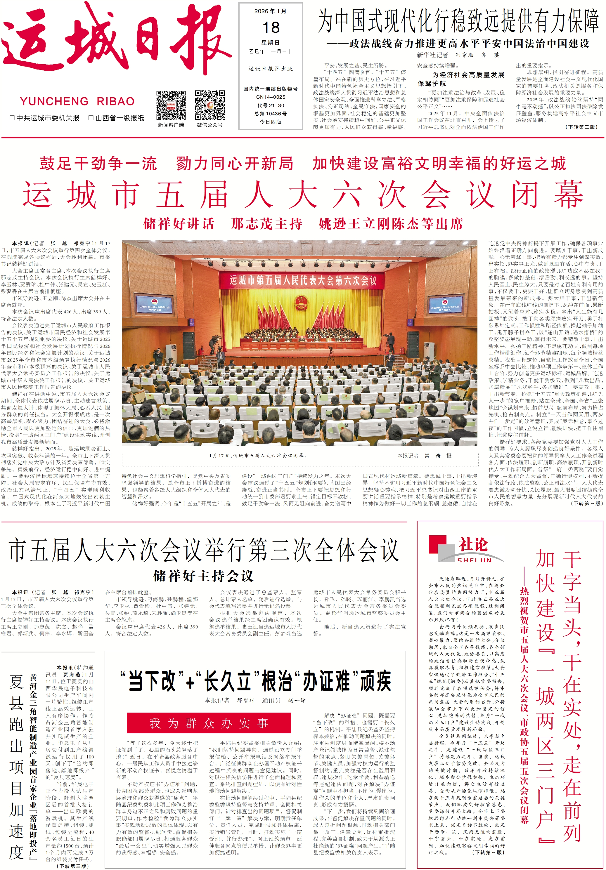 1月17日,市五届人大六次会议举行第四次全体会议,在圆满完成各项议程后,大会胜利闭幕。市委书记储祥好讲话。会议表决通过关于运城市人民政府工作报告的决议、关于运城市国民经 ...